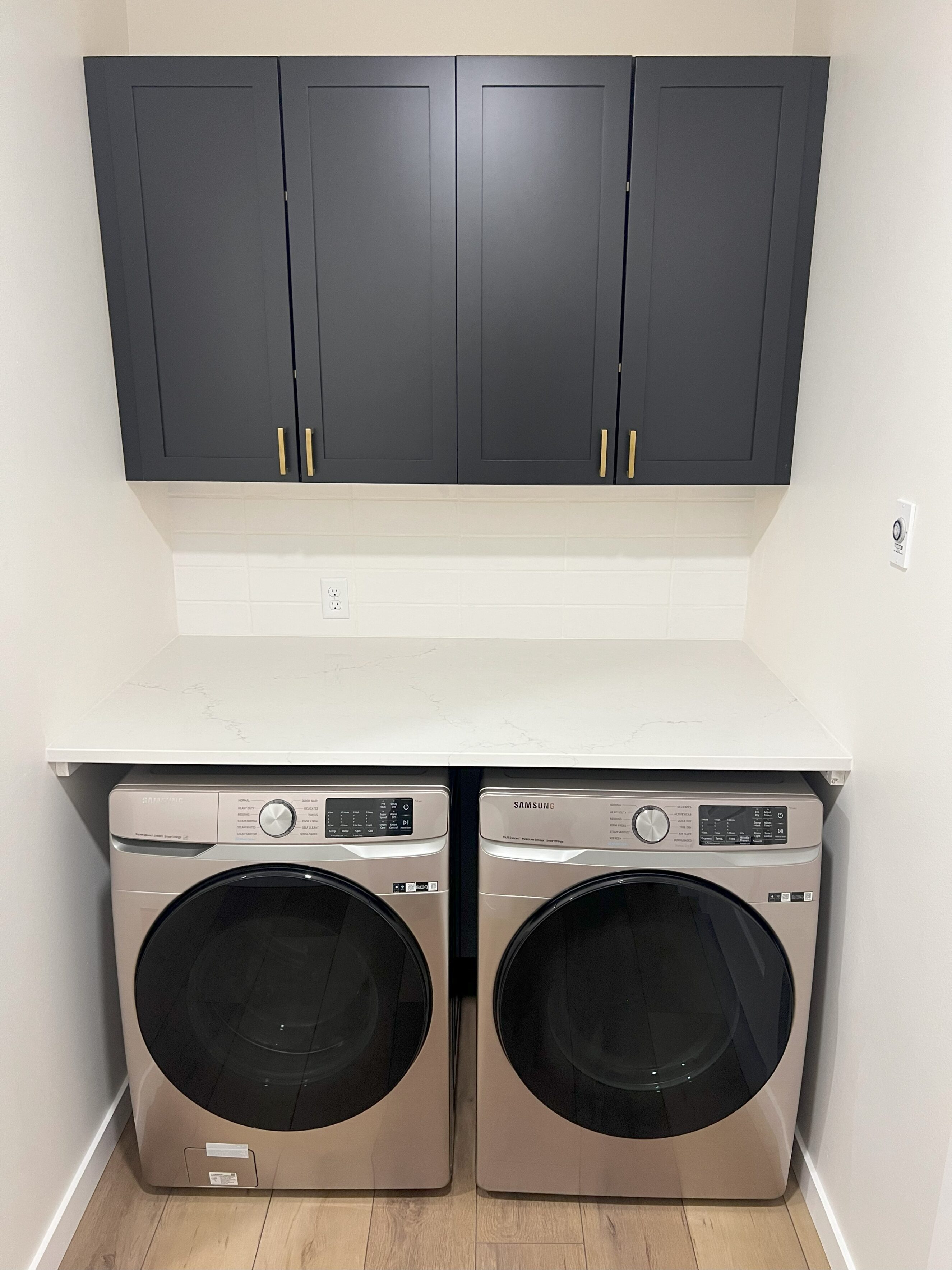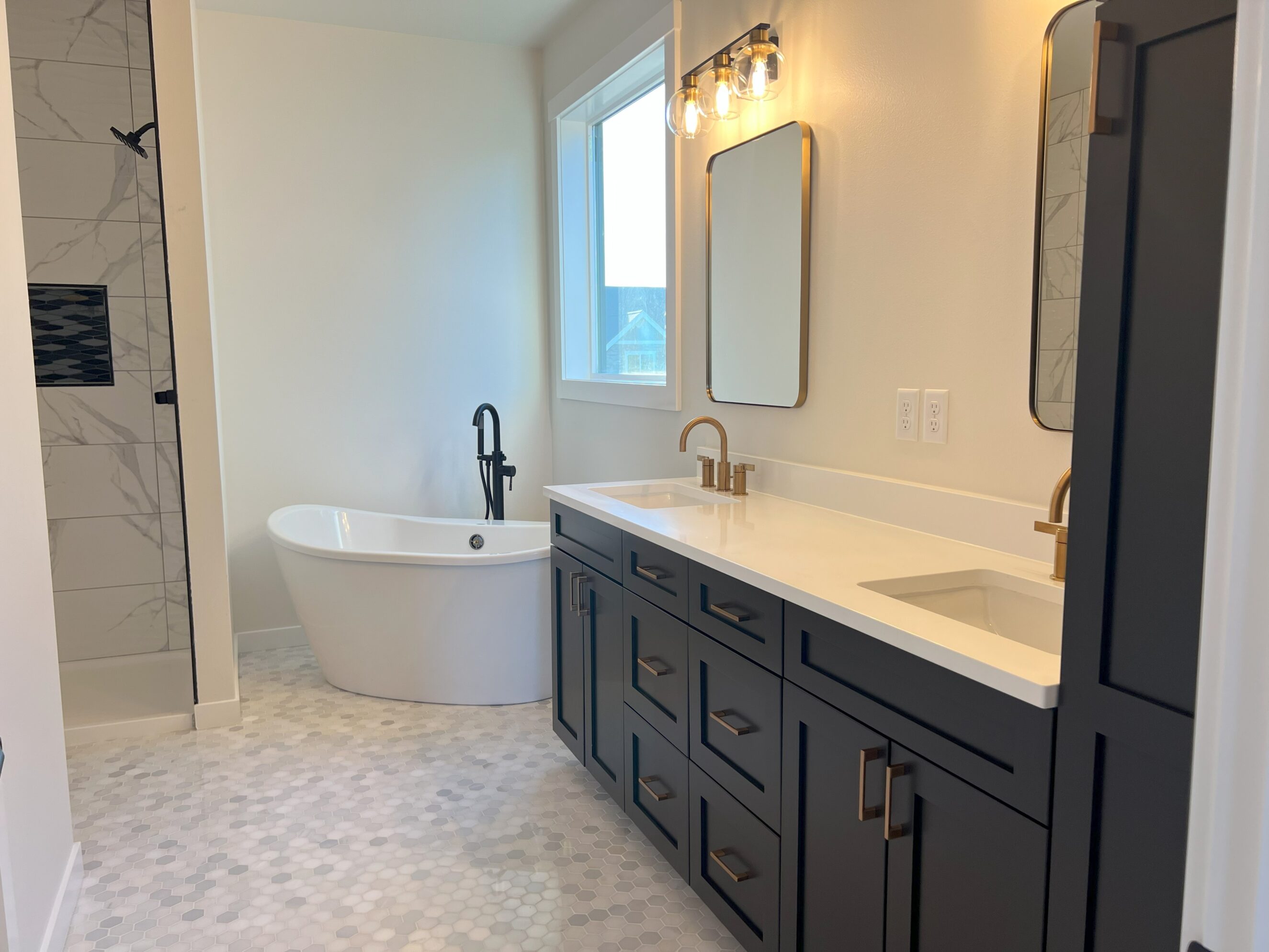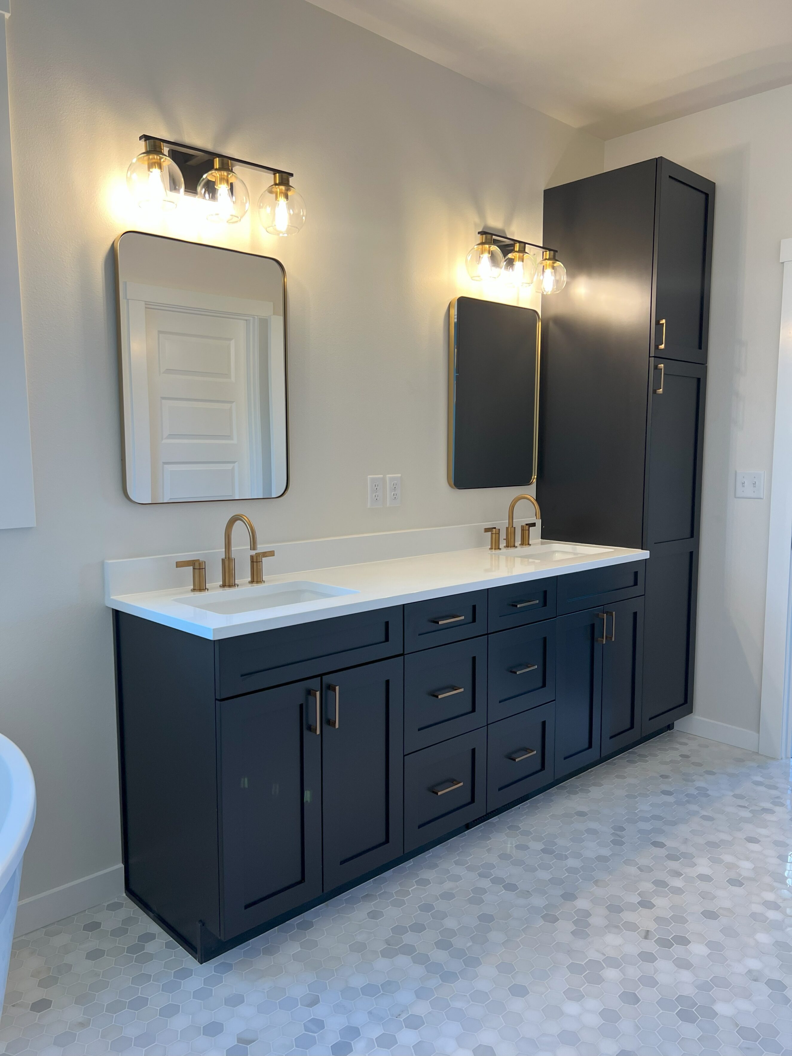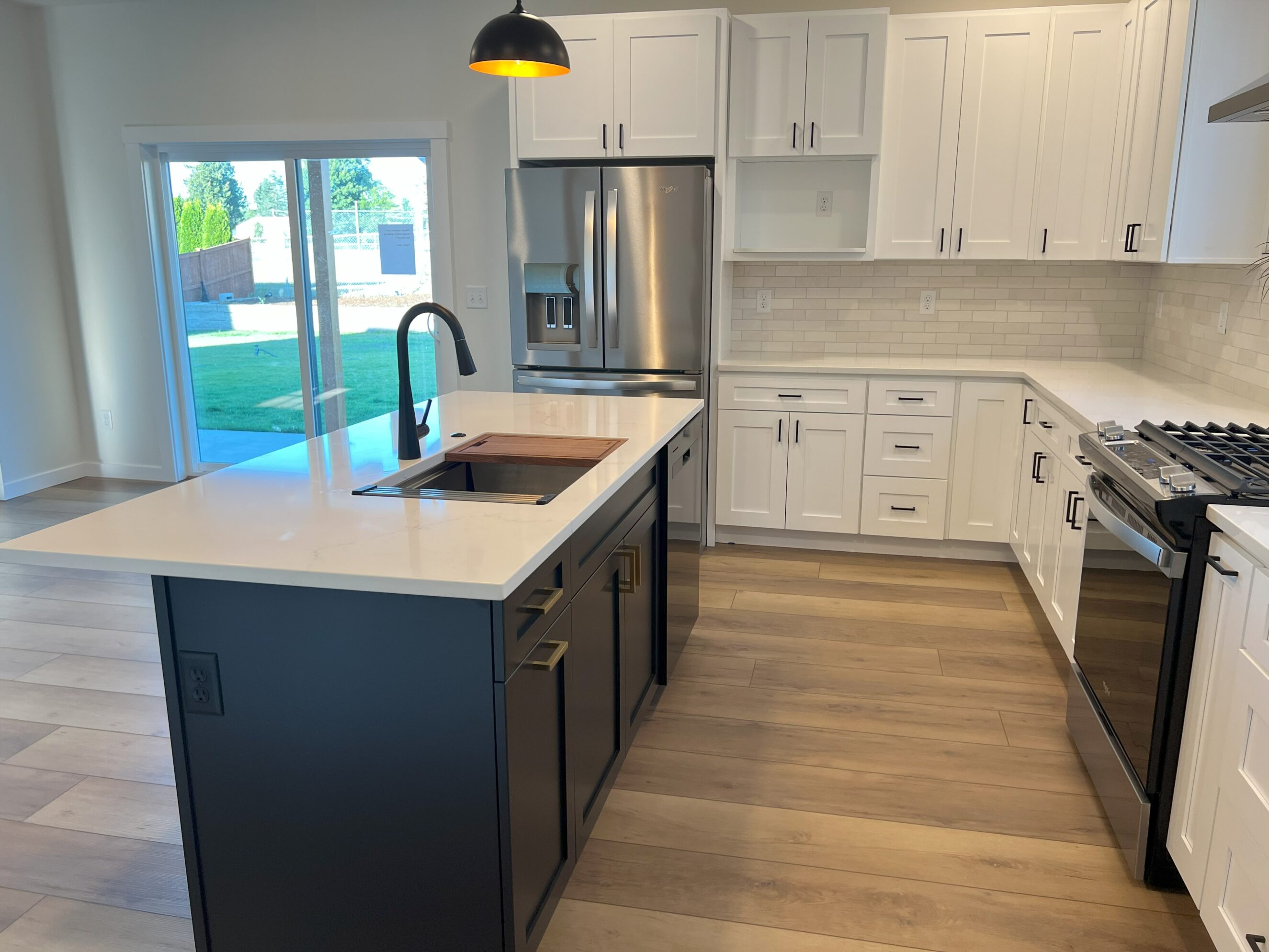 For this new build in Everson, we collaborated with the homeowner to select cabinetry, flooring, countertops, and bathroom tile that brought her vision to life. The bold black island cabinet in the kitchen and the striking black vanity in the bathroom add modern contrast and depth, while warm flooring and timeless finishes create balance. The result is a cozy, welcoming home with just the right mix of warmth, elegance, and contemporary style.