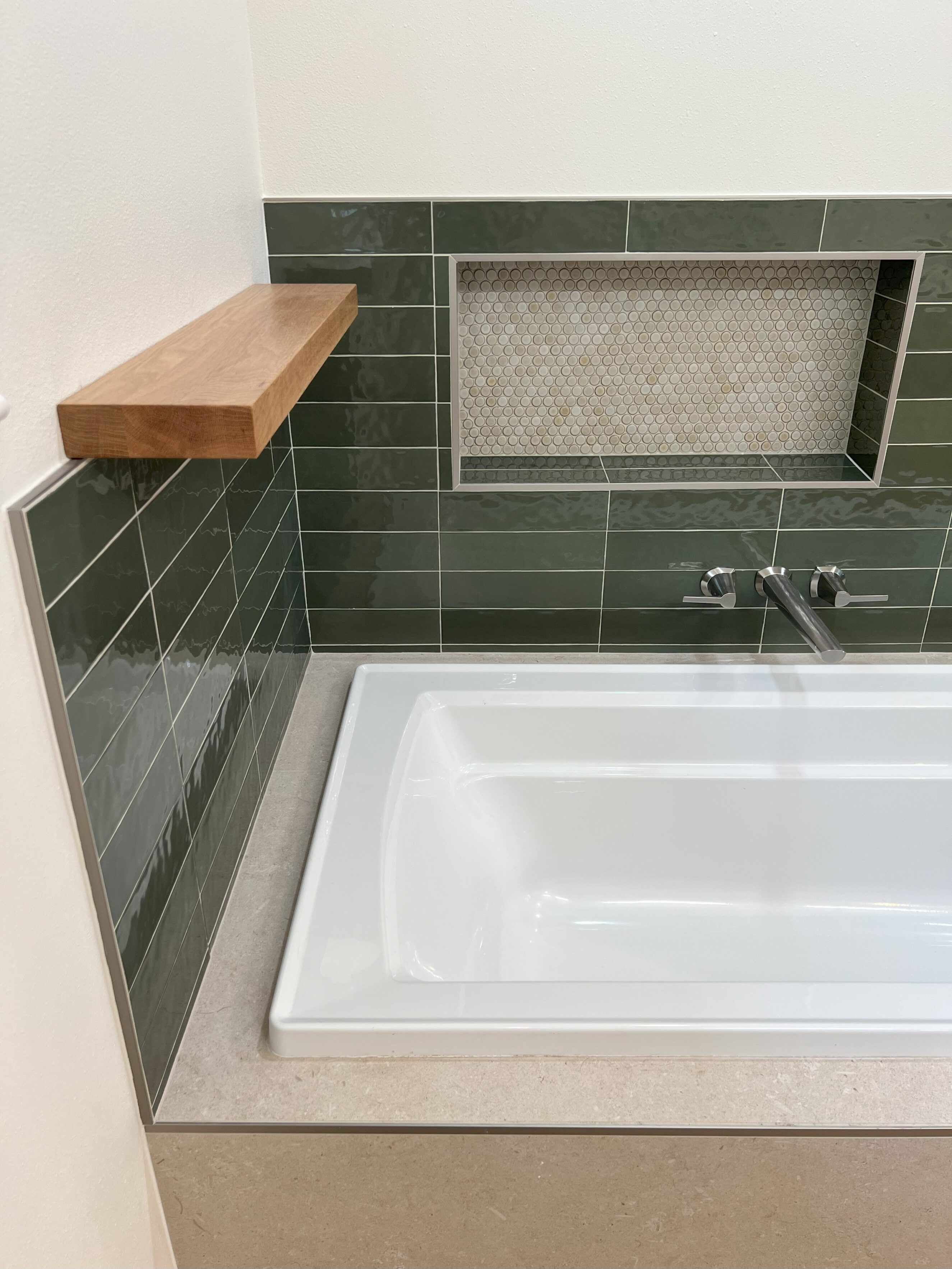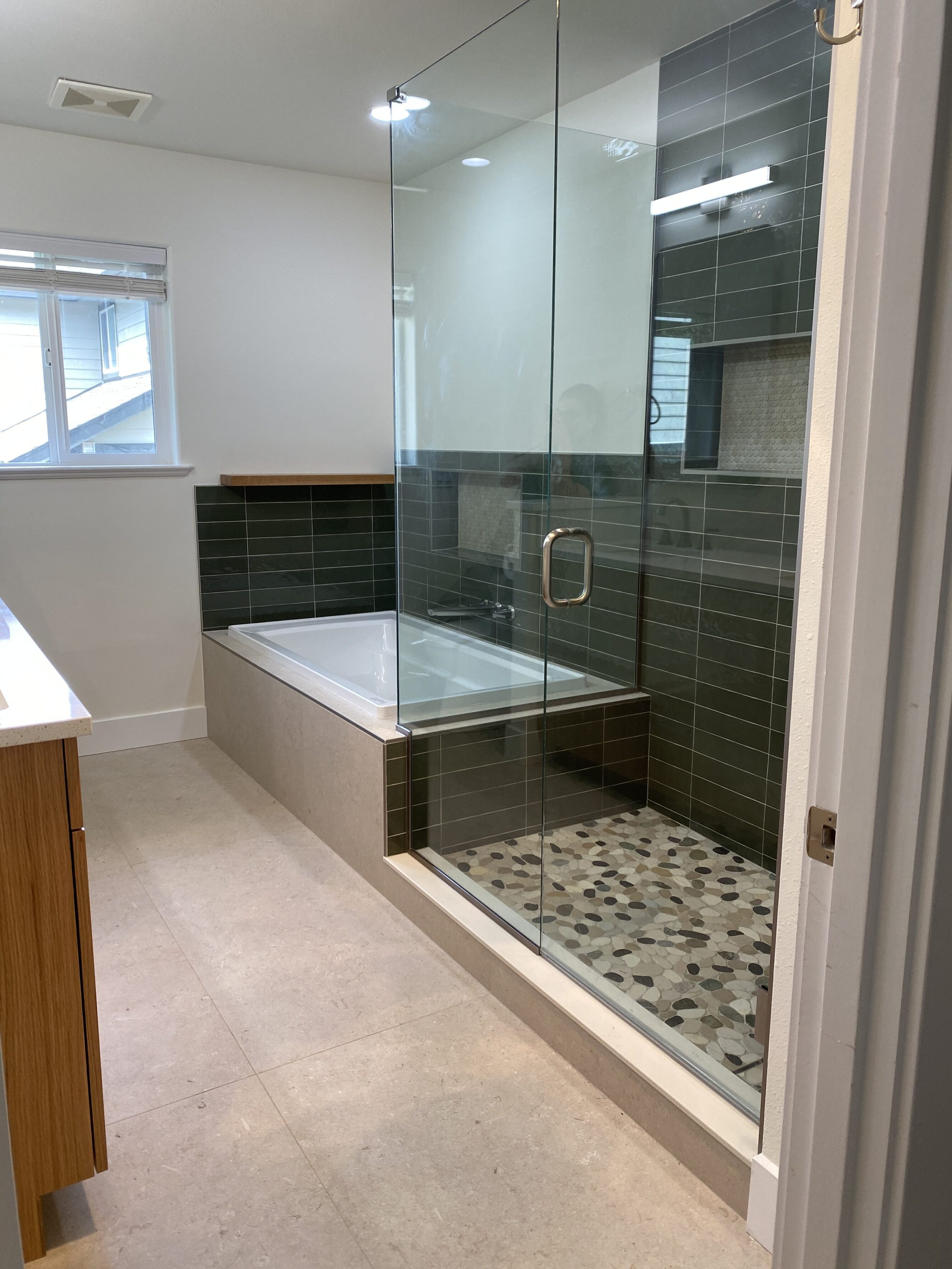 We redesigned this bathroom layout by removing a closet between the tub and shower to create a larger walk-in shower. Our team guided the client in selecting cabinets, tile, countertops, and lighting, bringing the vision to life with rift white oak cabinetry and a striking green shower wall tile for a fresh, modern look.