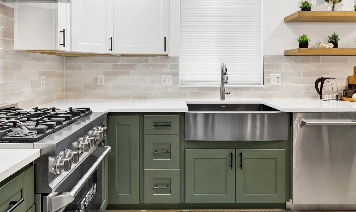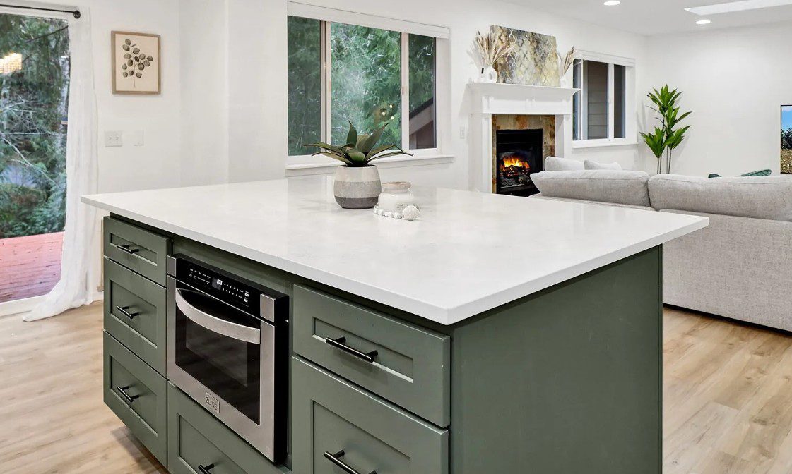 We transformed this kitchen after a water leak by expanding the layout and guiding our client through cabinet and countertop selections. The new design features sage green lower cabinets, crisp white shaker uppers, and sleek quartz countertops—bringing a fresh, timeless look to the space.